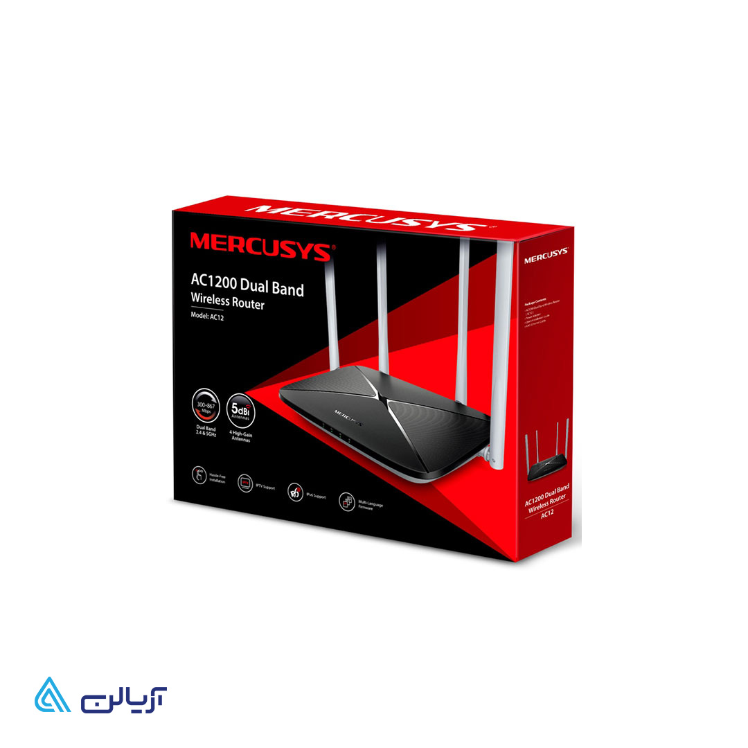 مودم مدل AC12 برند مرکوسیس به صورت بی سیم و با ۴ آنتن خارجی ۵dBi و فناوری پیشرفته می تواند به عنوان یک روتر عالی، پوشش گسترده تری از آنتن دهی بی سیم را ارائه دهد و قدرت دریافت سیگنال بی سیم را در سراسر خانه یا محل کار در ابعاد محیطی بزرگ فراهم کند. این روتر بی سیم WiFi مطابق با استانداردهای ۸۰۲٫۱۱a/n/ac و ۸۰۲٫۱۱b/g/n ارائه شده است که از سرعت بالایی پشتیبانی می کند تا کاربر با گوشی موبایل و دیگر دستگاه ها از سرعتی چند برابری در استفاده اینترنت برای کاربردهای متفاوت و حتی پخش آنلاین روان و بدون تاخیر ویدئوها لذت ببرد. این مودم سری AC1200 از باند دوگانه همزمان ۲٫۴ گیگاهرتز و ۵ گیگاهرتز برای اتصال بهره برده که هر دو باند همزمان کار می کنند تا تجریه سرعت بالای اینترنت و نیازهای چندین فعالیت را در دستگاه های مختلف برای کاربران برآورده نمایند. باند ۲٫۴ گیگاهرتز برای کارهای روزمره مانند گشت و گذار در اینترنت، ارسال ایمیل و … را با سرعت ۳۰۰ مگابیت بر ثانیه انجام می دهد و باند دوم با قدرت ۵ گیگاهرتز در مواقع لزوم وارد عمل می شود و سرعت را به ۸۶۷ مگابیت در ثانیه می رساند تا بتوانید همزمان بصورت آنلاین بازی کنید و پخش ویدئو HD و … را به راحتی دریافت و مشاهده کنید بر روی این مودم روتر ۴ آنتن Mercusys AC12، دکمه پاور دستگاه، دکمه ریست و کلید WPS تعبیه شده است.WPS امنیت در رمزگذاری دستگاه را قوی تر خواهد کرد تا از هک پسورد و استفاده از حجم اینترنت توسط دیگران جلوگیری شود. امنیت بی سیم این دستگاه از طریق رمزگذاری WPA-PSK / WPA2-PSK پشتیبانی می شود که از شبکه وای فای در برابر تهدیدات امنیتی و ورود مزاحمان محافظت کرده و یک دیوار دفاعی محکمی را به وجود خواهد آورد. در پشت این مودم یک سری درگاه های خروجی برای اتصال شبکه و دیگر دستگاه ها تعبیه شده که شامل ۳ عدد پورت اترنت LAN و ۱ عدد پورت اترنت WAN است. نشانگرهای LED نیز بر روی این مودم قرار دارند که وضعیت اتصال و برقراری اینترنت را نشان می دهند. یک سری فناوری برای کنترل مدیریت آسان تر برای این دستگاه بی سیم WiFi فراهم شده مانند Guest Network Access که دسترسی Wi-Fi را برای مهمانان به صورت شبکه ای در خانه یا دفتر کار به اشتراک می گذارد و پروتکل IPv6 که بهره وری از شبکه و سرعت بالا در مشاهده وب سایت ها و پخش آنلاین را بهینه سازی می کند